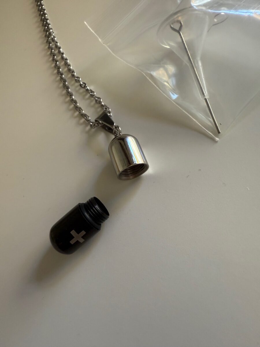 Keep your loved one’s memory close with this Black and Silver Capsule Urn Necklace, a sleek and modern way to hold a small portion of ashes, soil, or other mementos. The pendant features a polished stainless steel capsule design with a cross cutout, symbolizing faith, healing, and eternal love.