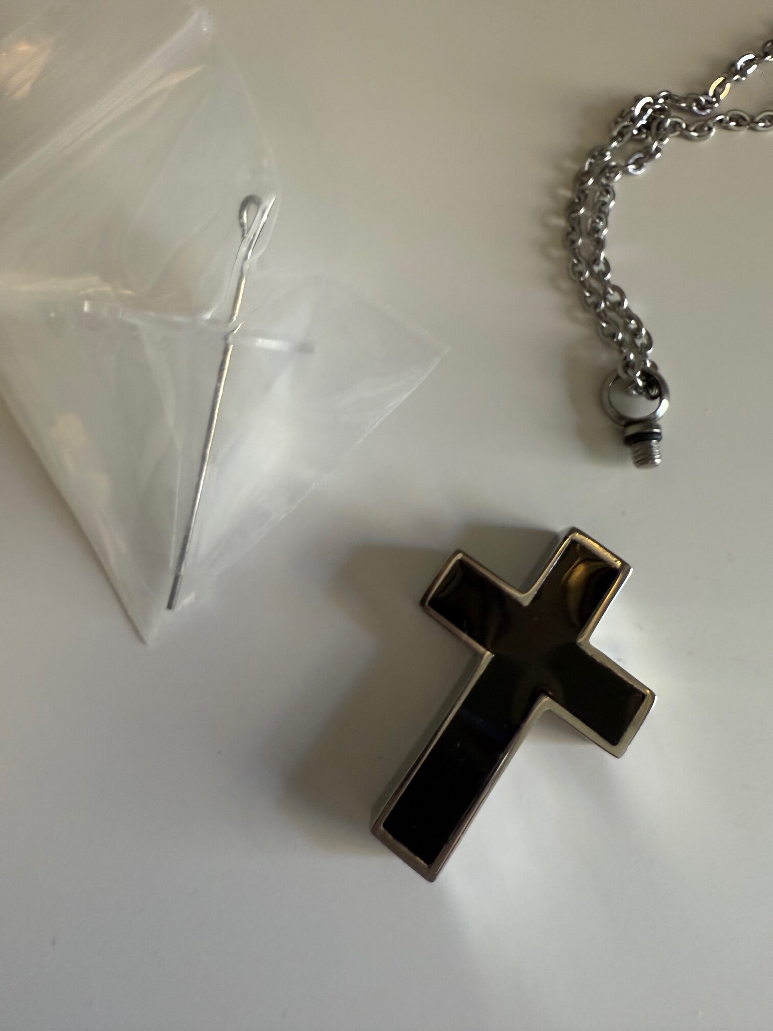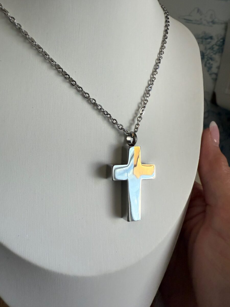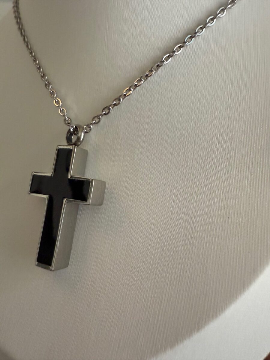 Honor and remember your loved one with this stainless-steel cross urn necklace. Thoughtfully designed with a secure screw-top opening and funnel kit included, this memorial pendant allows you to safely fill it with ashes, hair, dried flowers, or other tiny keepsakes. The cross design represents faith and eternal love, making it a meaningful piece of remembrance jewelry.