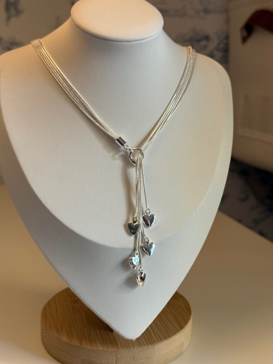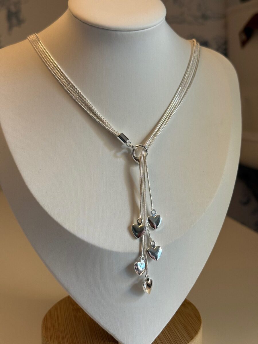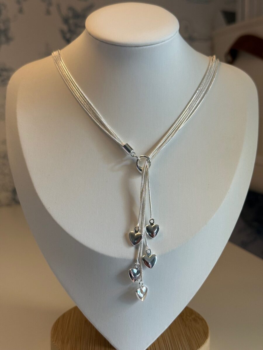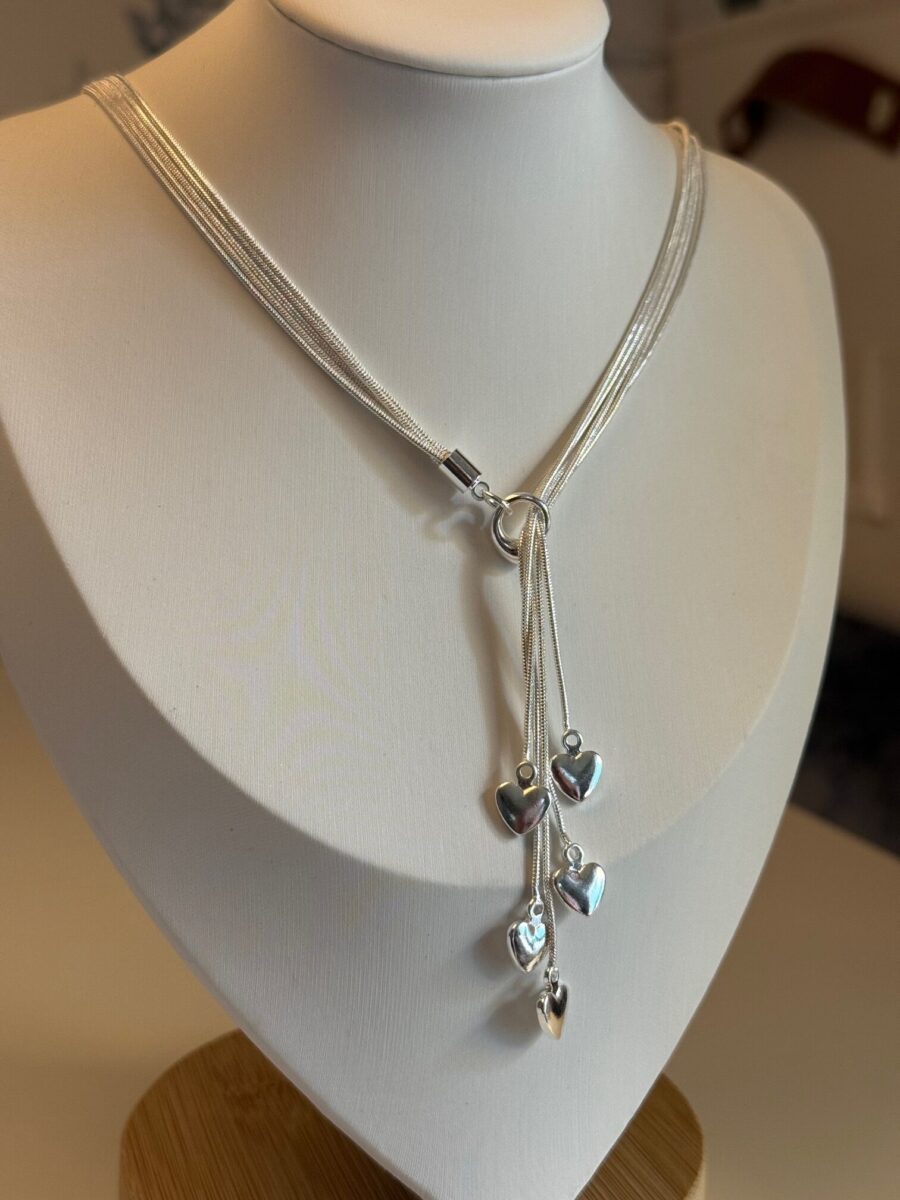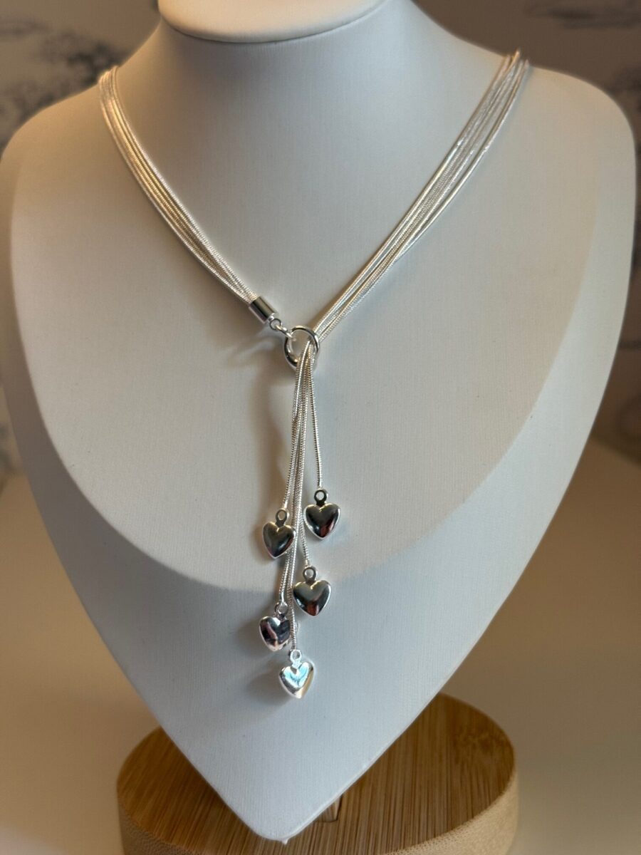 Fall in love with the delicate beauty of this 925 Sterling Silver Heart Necklace. Featuring multiple polished silver heart charms that dangle gracefully, this necklace adds the perfect touch of romance and elegance to any outfit.