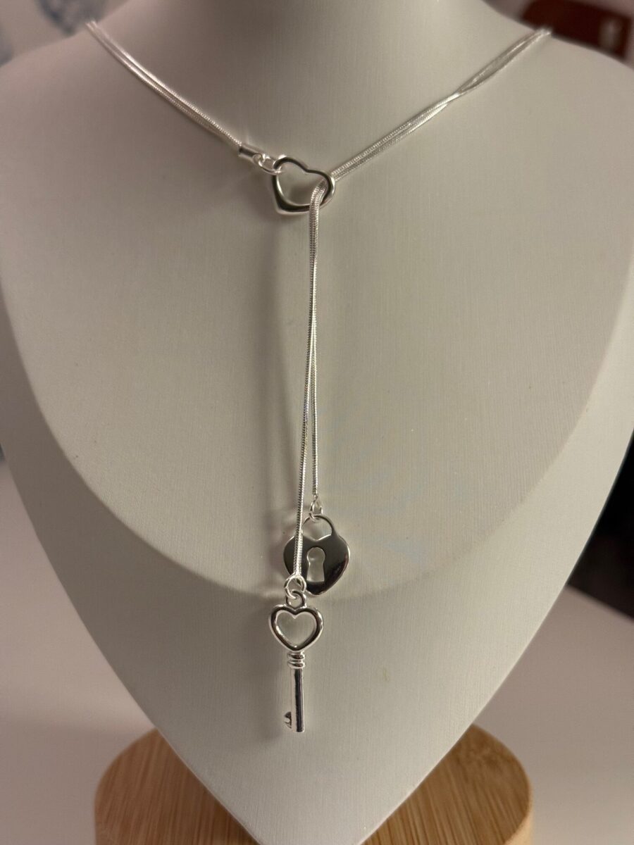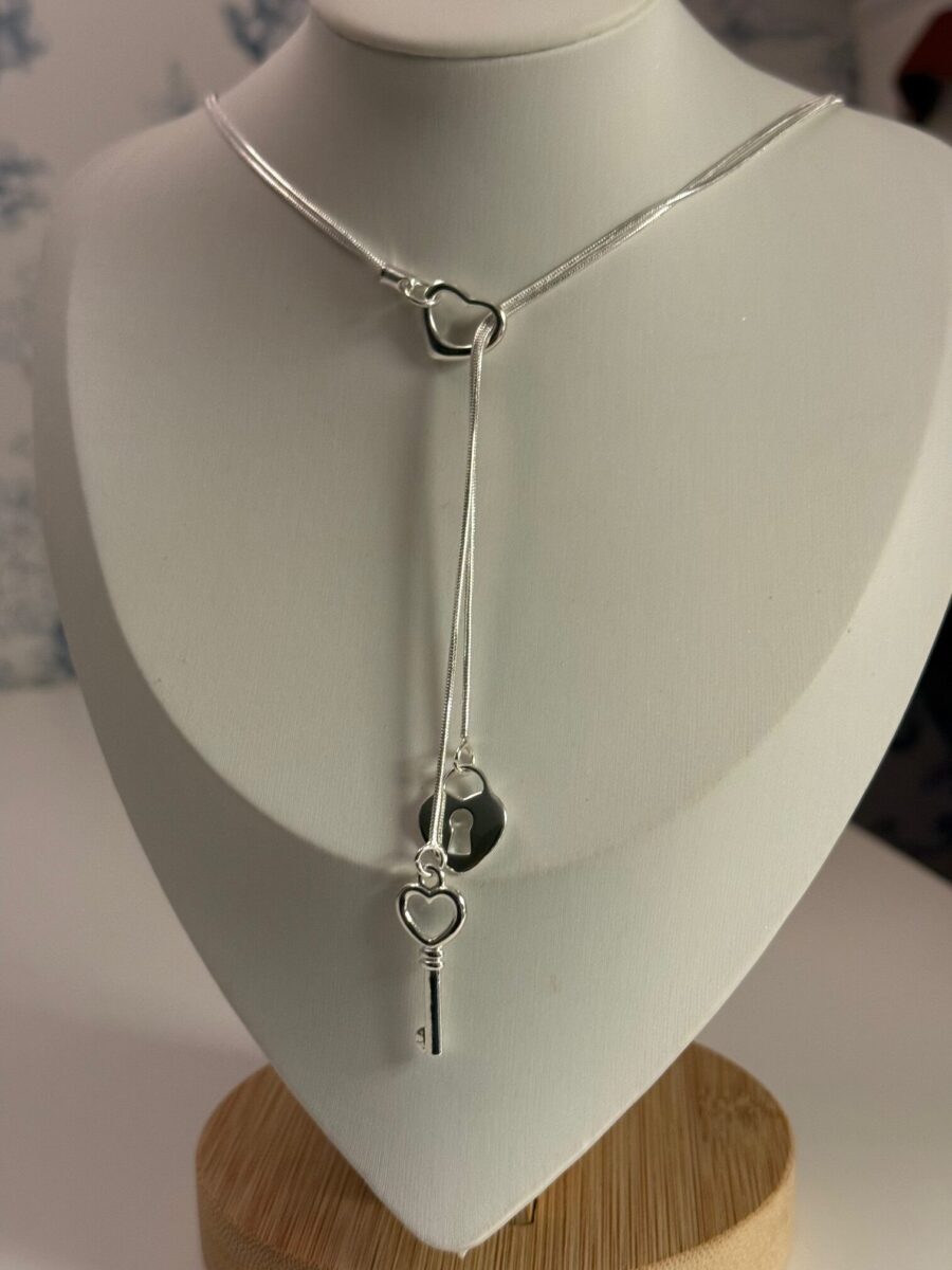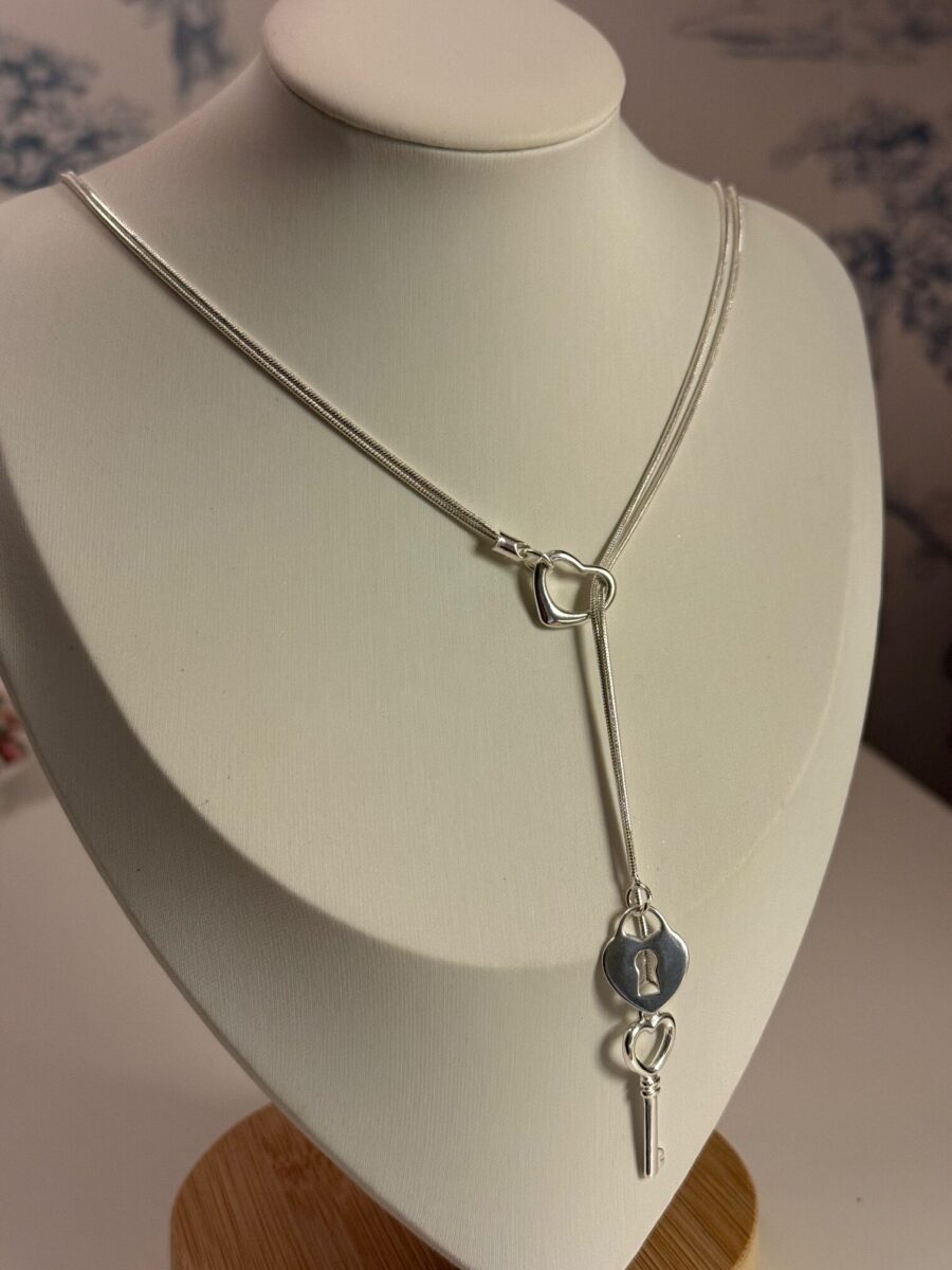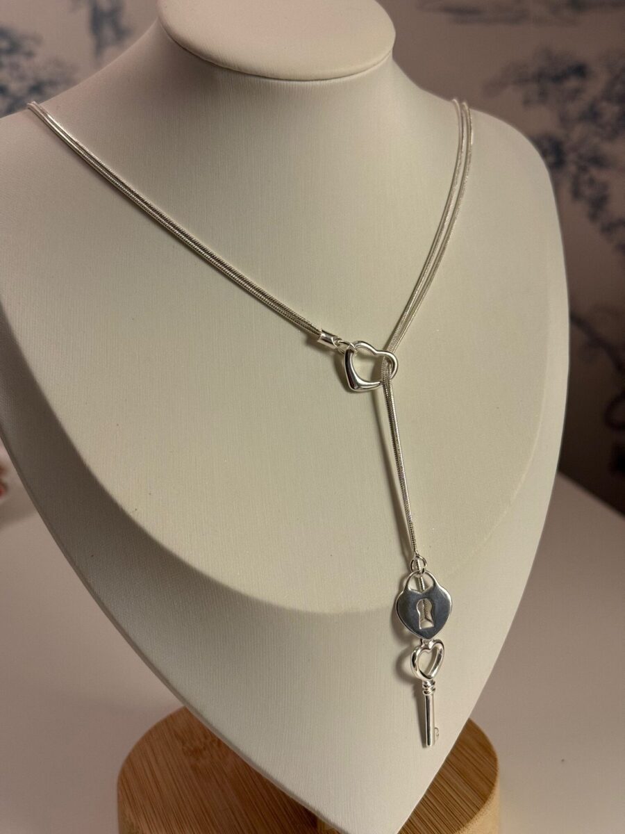 This sterling silver heart lock and key lariat necklace features a romantic, minimalist design symbolizing love, trust, and connection. The sleek Y-style silhouette showcases a delicate heart-shaped lock charm paired with a matching silver key, creating a meaningful and elegant statement piece.